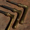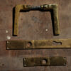 Комплект латунних ручок на металевому квадраті, з накладками, Одна накладка коротша і не має отвору для замка - це особливіть дверних ручок для балконів.